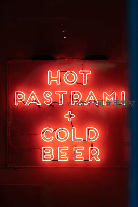 一块鲜红的霓虹灯牌以简洁字体宣告“HOT PASTRAMI + COLD BEER”,在暗色背景下散发诱人暖光,吸引食客驻足。