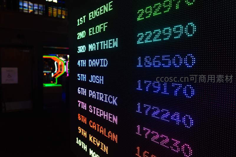 一块大型LED显示屏上用彩色像素点展示着前十名玩家姓名与得分,背景隐约可见游戏机台,充满竞技感。