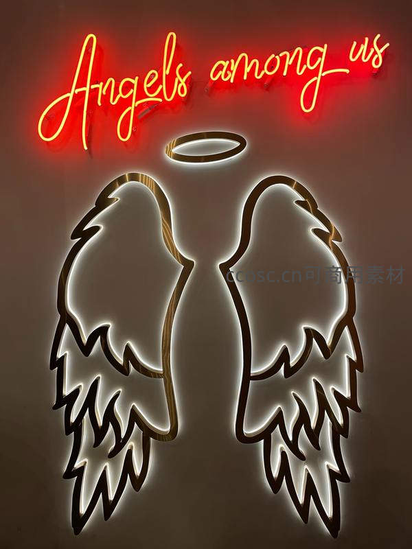 墙上发光的白色天使翅膀与金色光环,上方红色霓虹写着“Angels among us”,整体充满神圣与现代艺术感,适合室内装饰或展览空间。
