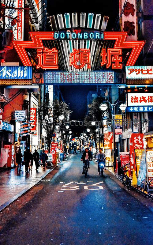 大阪道顿堀夜市入口,巨型霓虹拱门闪烁着“Dotonbori”字样,街道两旁店铺林立,行人与骑行者穿梭其中,尽显亚洲都市夜生活的活力。