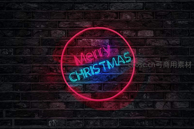 圆形粉色霓虹灯框内,'Merry Christmas'字样以粉蓝双色呈现,温暖光芒映照在深色砖墙上,营造出浓厚的节日氛围与现代感。