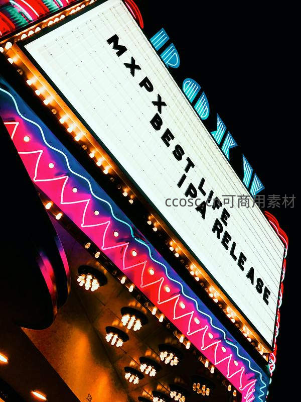 色彩斑斓的霓虹灯带环绕着剧院式广告牌,上面醒目地写着'MX PX BEST LIFE IPA RELEASE',宣告一场充满活力的精酿啤酒发布会即将开始。