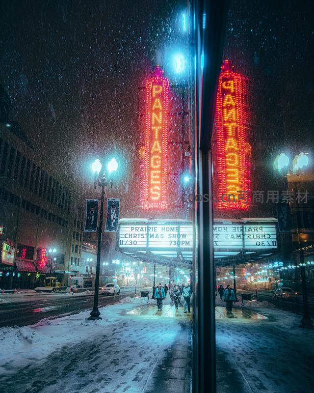 雪夜中的剧院霓虹温暖如画