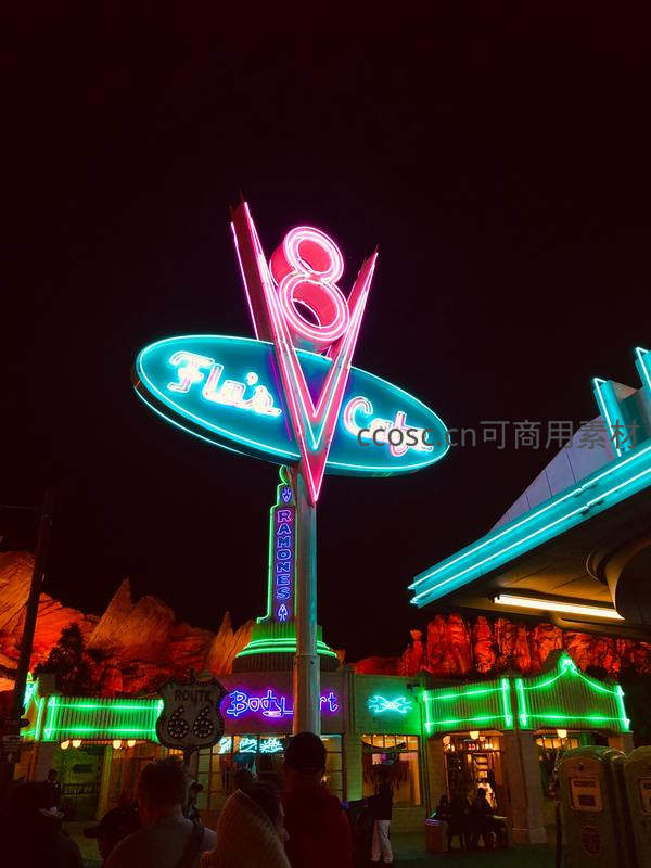 巨大V8造型霓虹灯牌在漆黑夜空中格外醒目,下方是充满未来感的绿色建筑群,游客在光影中穿行,整个场景洋溢着奇幻与活力的游乐氛围。
