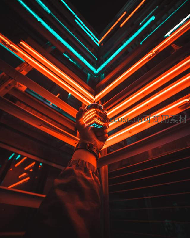 双手托举发光装置,置身于橙蓝交织的霓虹隧道中,展现强烈的未来科技美学与沉浸式视觉体验。