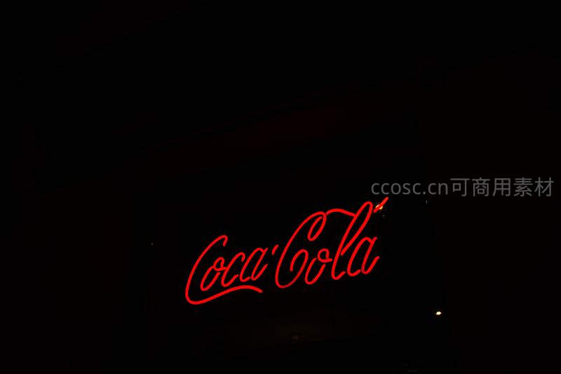 在黑暗环境中,标志性的红色Coca-Cola草书字体霓虹灯招牌散发着温暖光芒,唤起人们对经典品牌的怀旧情感。