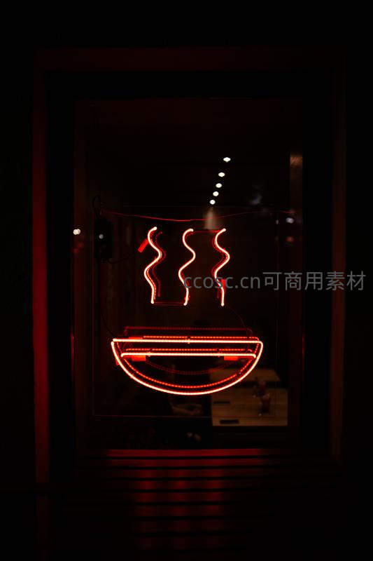 一个由红色霓虹灯管构成的杯面图案,碗口上方升起三缕弯曲的“热气”,在暗处营造出诱人的美食氛围和视觉趣味。