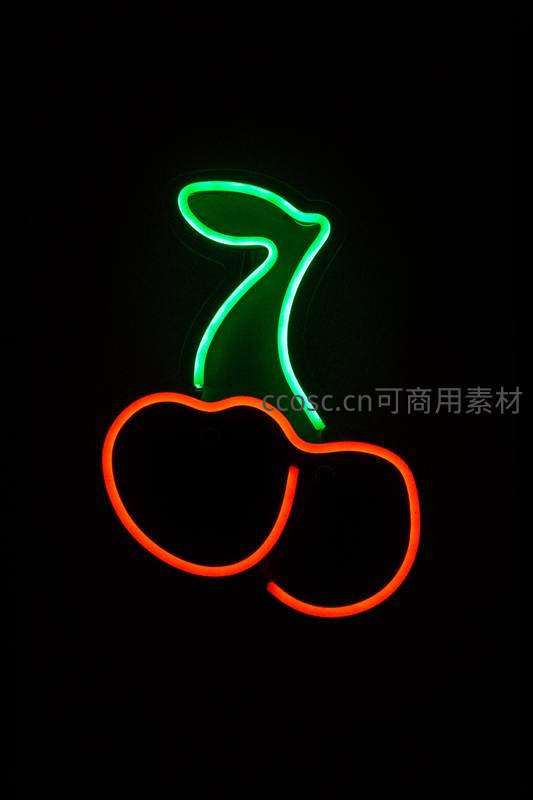 在纯黑背景下,一个由霓虹灯管构成的樱桃图案熠熠生辉,绿色的茎与红色的果实形成鲜明对比,充满现代艺术感和视觉冲击力。