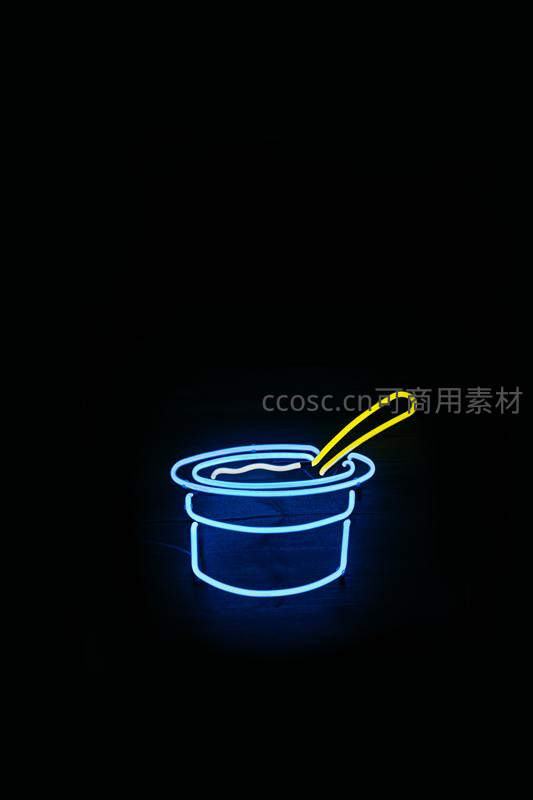 蓝色霓虹酸奶杯配黄色勺子灯光装饰