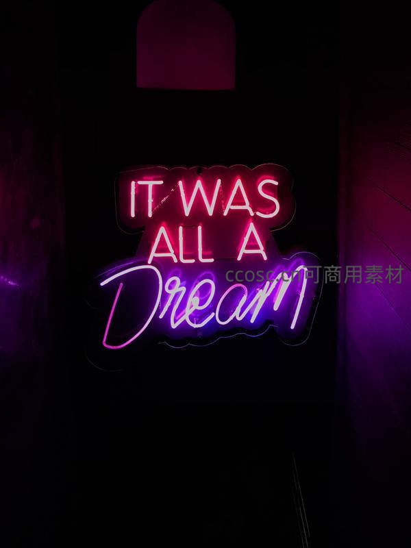 粉色与紫色渐变霓虹灯组成“It Was All A Dream”字样,在黑暗中散发柔和光芒,营造浪漫梦幻氛围,适用于卧室、咖啡馆或艺术展览空间。