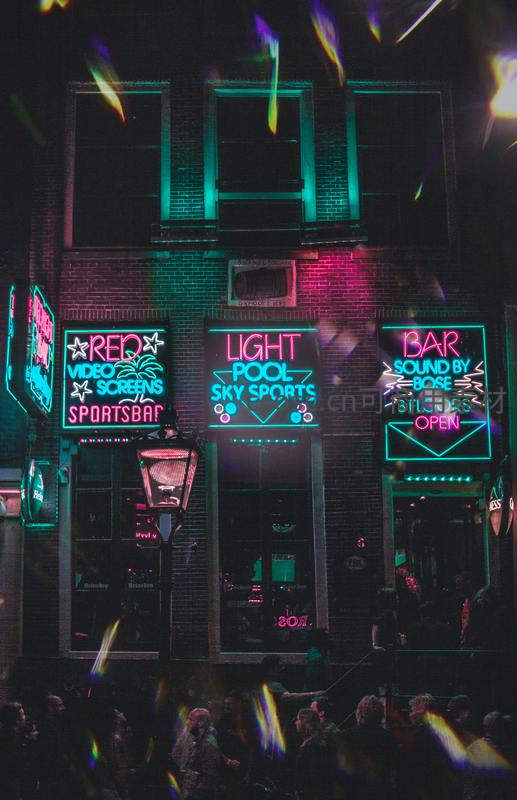 砖墙建筑上挂满彩色霓虹招牌,标示着“LIGHT POOL”、“BAR”等娱乐项目,街头人影攒动,充满都市夜生活的活力与喧嚣。