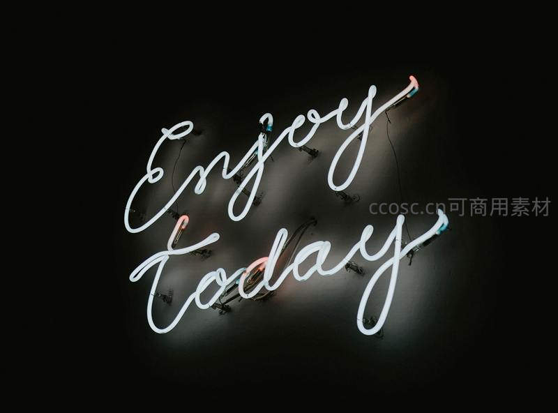 纯黑背景下,一盏优雅的白色手写体霓虹灯亮起“Enjoy Today”字样,简洁而有力地传递活在当下的积极信息,是极简主义风格的装饰艺术作品。