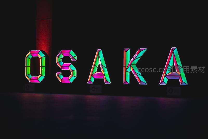 在黑暗背景中,由多彩几何块组成的‘OSAKA’霓虹灯字样熠熠生辉,营造出未来感十足的都市夜景氛围。