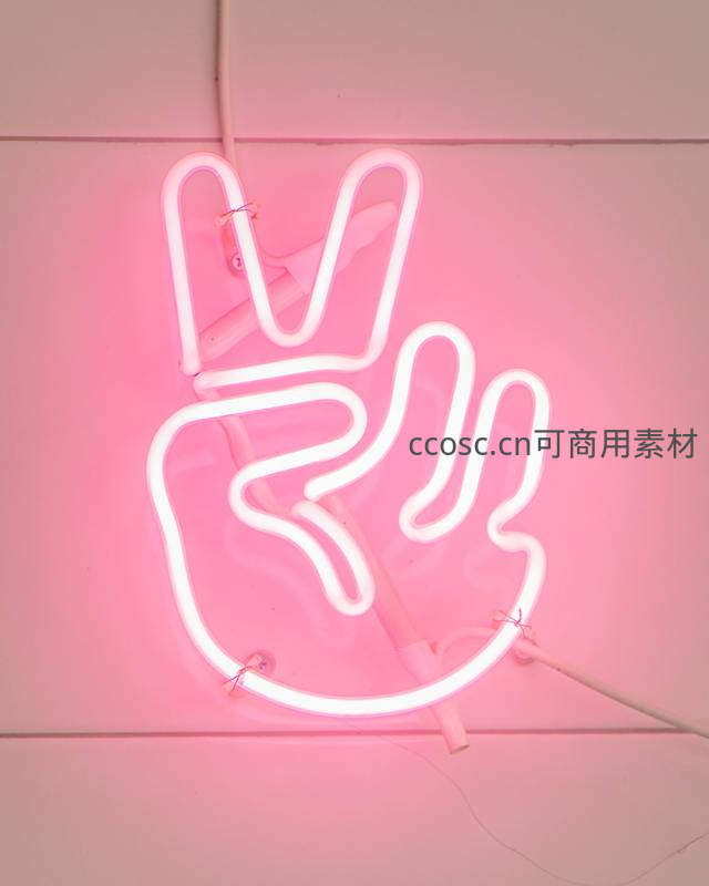 一面浅粉色墙壁上悬挂着一个发光的白色霓虹灯和平手势,柔和的粉光弥漫四周,传递着宁静与友爱的气息。