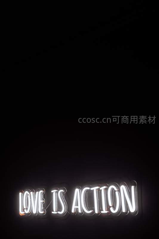 纯黑背景下,一行明亮的白色霓虹灯英文“LOVE IS ACTION”静静发光,简洁有力地传达爱是行动而非空谈的理念。