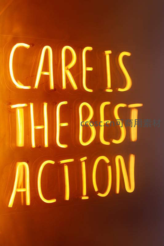一面墙上亮着金黄色的霓虹灯,清晰显示“CARE IS THE BEST ACTION”,柔和光线渲染出温馨感,强调关怀在行动中的重要性。