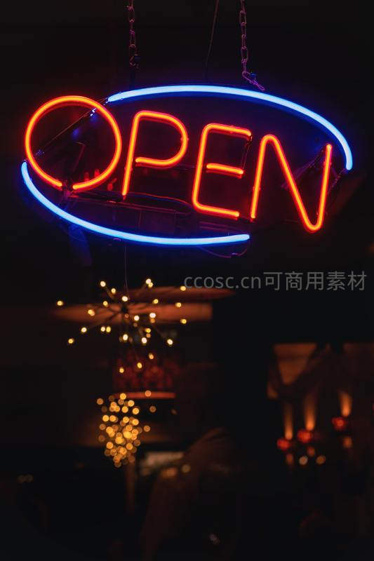 蓝红双色OPEN霓虹招牌悬挂夜空