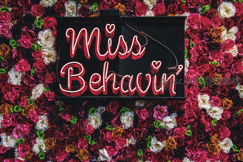 一面由各色玫瑰花组成的背景墙,中央镶嵌着红色霓虹灯管拼成的'Miss Behavin''字样,充满浪漫与叛逆的艺术气息。