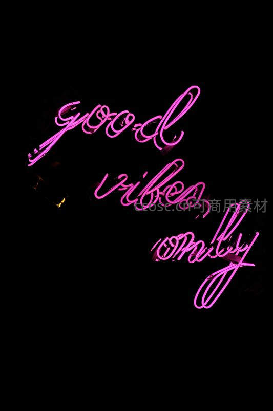 纯黑背景下,一串粉紫色手写体霓虹灯管亮起“good vibes only”字样,营造出神秘而积极的视觉氛围,极具现代设计感。