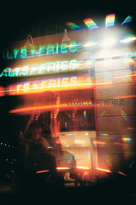 长曝光下人物剪影与霓虹招牌交融,彩色光轨穿梭其间,呈现梦幻而富有动感的街头艺术瞬间。