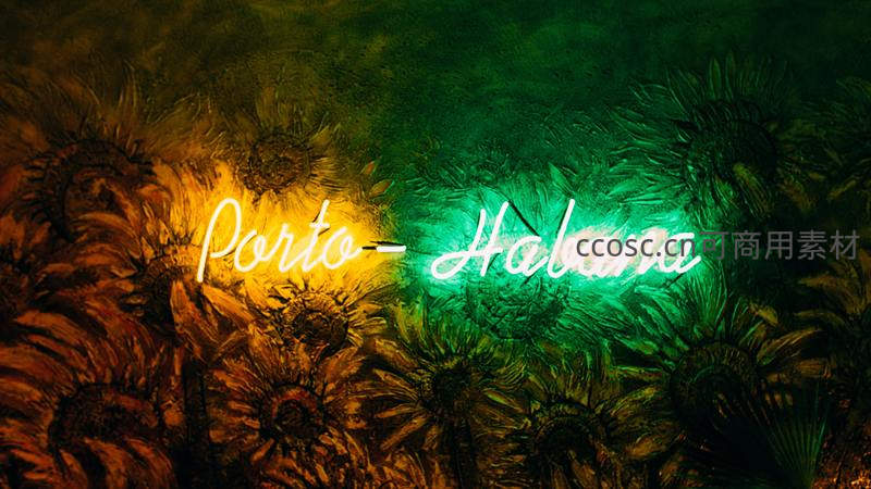 绿色与黄色霓虹灯勾勒出“Porto-Habana”字样,背景是深色向日葵图案墙面,光影交错营造出梦幻而艺术的视觉效果。