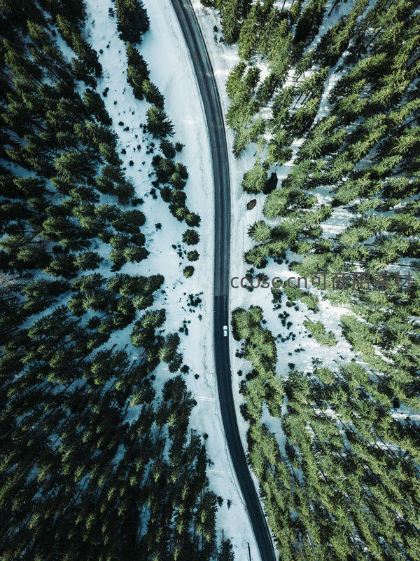 从高空俯瞰,一条笔直的公路如黑色丝带般切开被白雪覆盖的茂密松林,一辆白色汽车正行驶其中,构成一幅静谧而富有几何美感的画面。