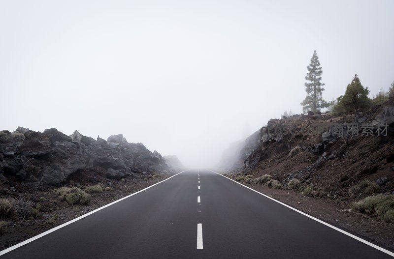 浓雾笼罩着一条笔直的柏油路,两侧是崎岖的火山岩地貌,路边孤零零的树木在雾中若隐若现,营造出一种空旷、神秘且略带寂寥的氛围。