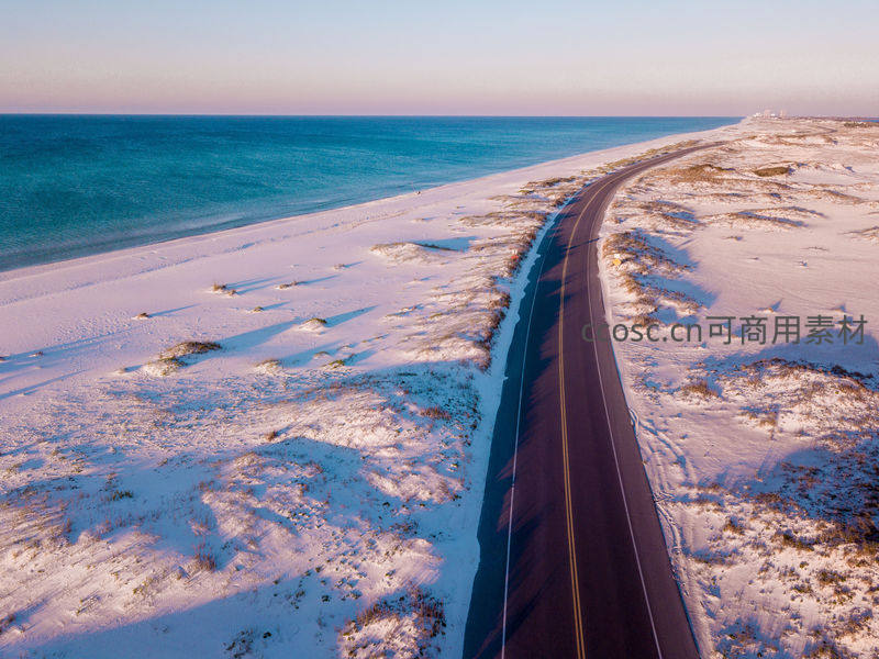 从高空俯瞰,一条笔直的公路沿着洁白的沙滩延伸,与湛蓝的海洋并行。夕阳的余晖洒在沙丘上,光影交错,构成一幅宁静而壮丽的海滨画卷。