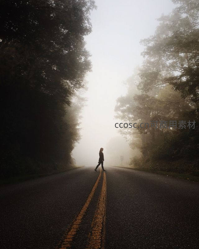 浓雾弥漫的林间公路上,一个孤独的身影正沿着双黄线前行,两侧树木若隐若现,营造出静谧又略带神秘的氛围。
