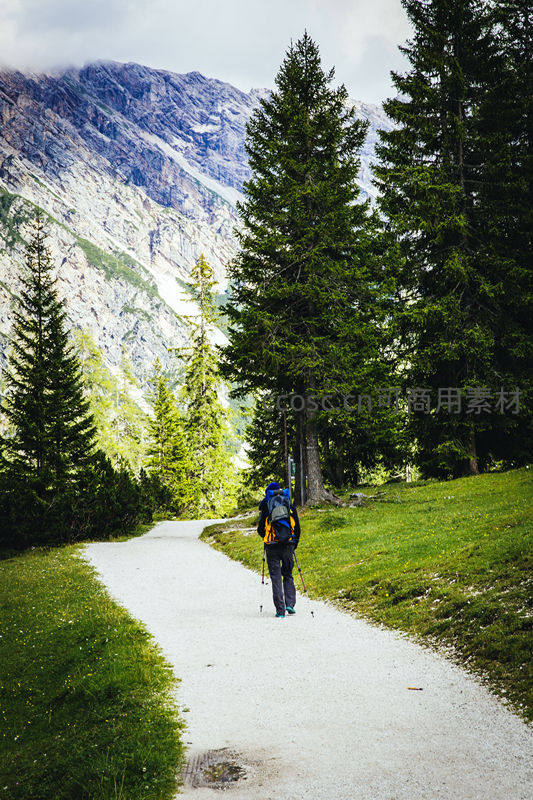 背包客穿行高山绿谷林道