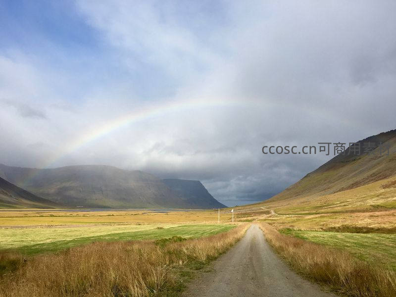一道绚丽彩虹高悬于山谷上空,下方是金黄草地与蜿蜒土路,远处山峦沉稳,展现雨后初晴的大自然奇迹。