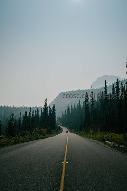 一条弯曲的柏油路穿行于苍翠的针叶林中,远处山峦隐没在薄雾里,一辆孤车驶向未知,营造出静谧而略带神秘的氛围。