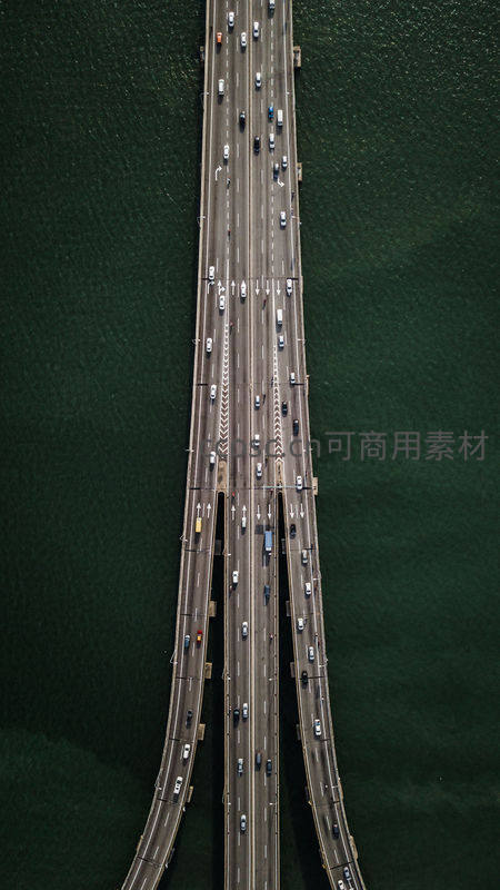 从高空俯瞰跨海大桥,车辆有序穿梭,桥体与水面形成完美对称倒影,展现现代交通的秩序感与城市工程的宏伟壮丽。