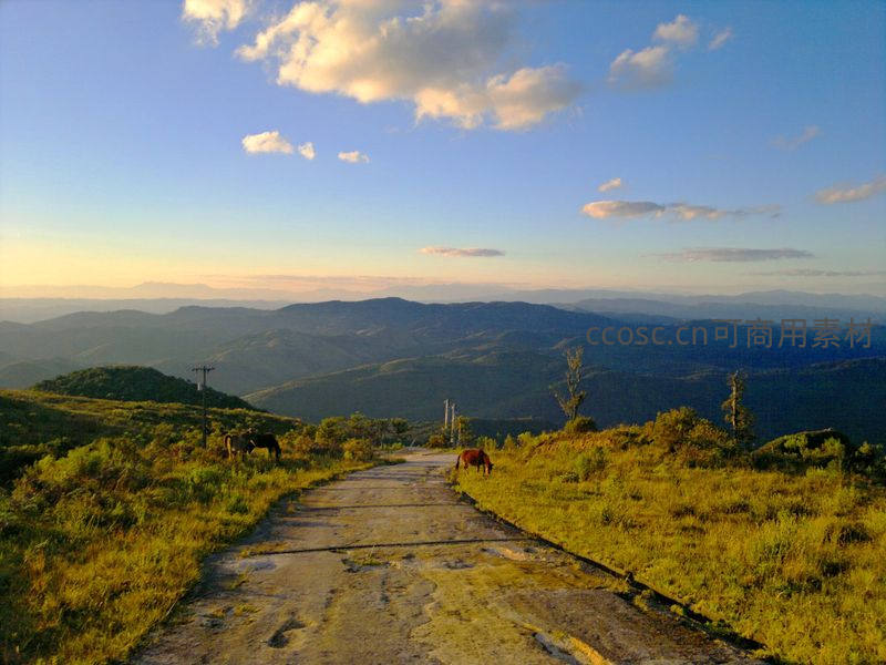 夕阳下山间小径马儿悠然吃草
