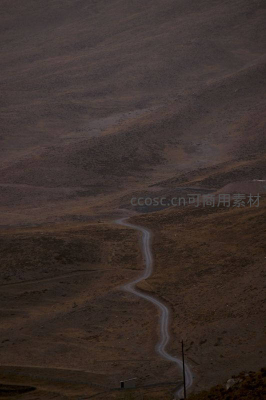 从高处俯视,一条细长的土路在苍茫高原上曲折延伸,周围是干燥的山坡和稀疏植被,光线昏暗,营造出一种原始而神秘的氛围。