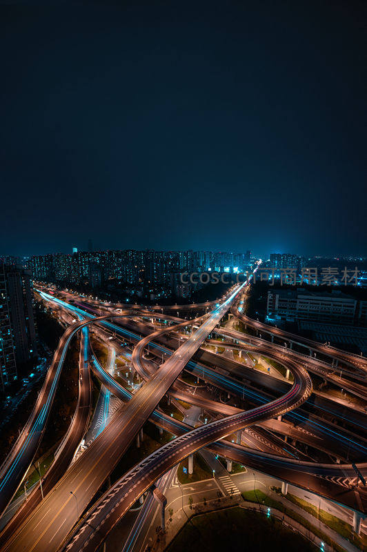 从高空俯瞰,城市立交桥在夜色中交织成光的网络,车辆尾灯划出流动的光轨,背景是灯火通明的居民区,展现都市的活力与秩序。