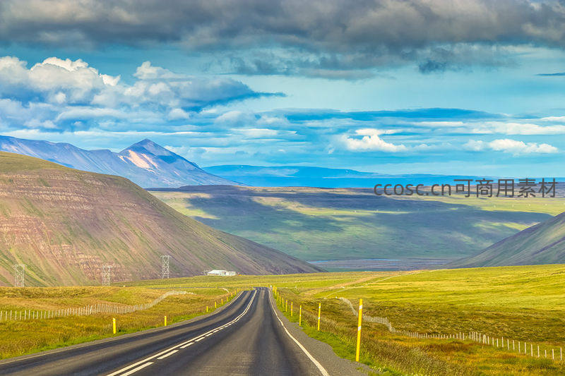 公路在色彩斑斓的山坡间穿行,远处山峰巍峨,天空云卷云舒,广阔无垠的草原与远山相映成趣,尽显自然之美。