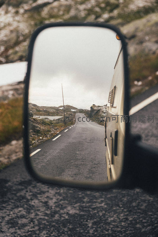 通过汽车后视镜捕捉到的山间公路景象,道路在岩石与植被间延伸,天空阴沉,营造出旅途中的静谧与探索感。