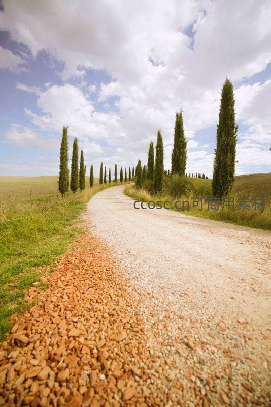 在阳光明媚的托斯卡纳乡间,一条铺满碎石的土路两旁排列着高耸挺拔的柏树,通向远方起伏的金色田野,天空湛蓝,云朵洁白。