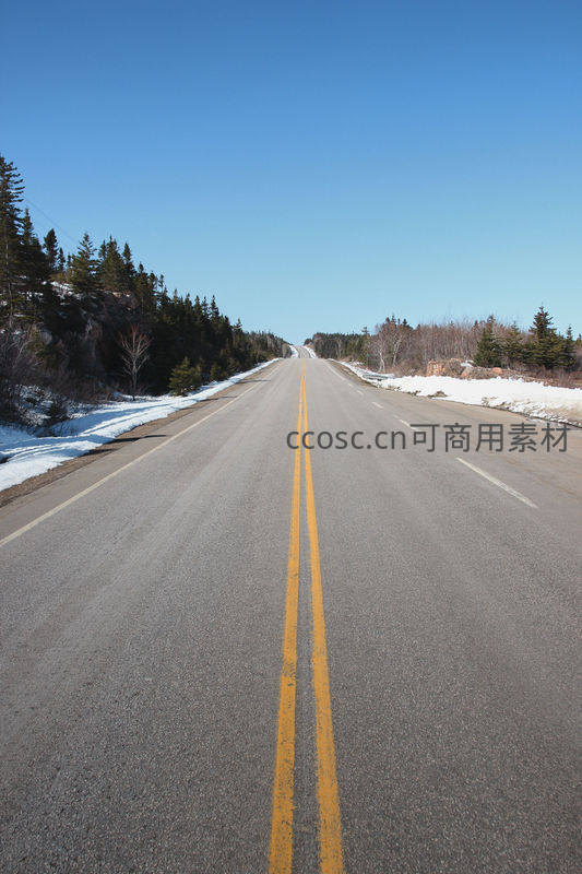 一条笔直的沥青公路在晴朗的蓝天下向前延伸,两侧是残留积雪的针叶林,双黄线清晰醒目,营造出一种开阔、纯净且充满希望的冬日景象。