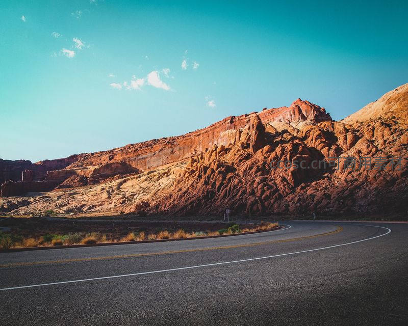 红岩峡谷旁的弯曲公路风景