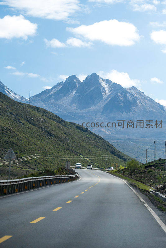 晴朗天空下,一条盘山公路沿着翠绿山坡延伸,远处雄伟雪山巍然屹立,几辆汽车行驶其上,构成一幅壮丽高原风景画卷。