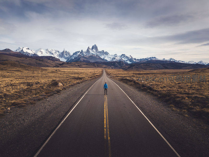 一人独行于辽阔荒原中央的笔直公路上,身后是雄伟壮丽的雪峰群,天地苍茫,人影渺小却坚定,象征着探索与内心的旅程。