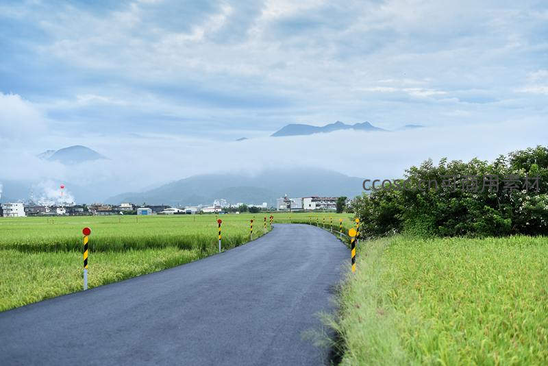 一条弯曲的柏油路穿过翠绿的田野,远处山峰被云雾半掩,路边点缀警示桩,展现宁静悠远的田园诗意景象。