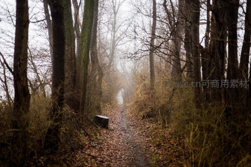 一条铺满枯叶的林间小路蜿蜒向前,两旁高大树木枝干交错,薄雾弥漫于林间,营造出深秋或初冬时节特有的静谧、萧瑟与诗意氛围。
