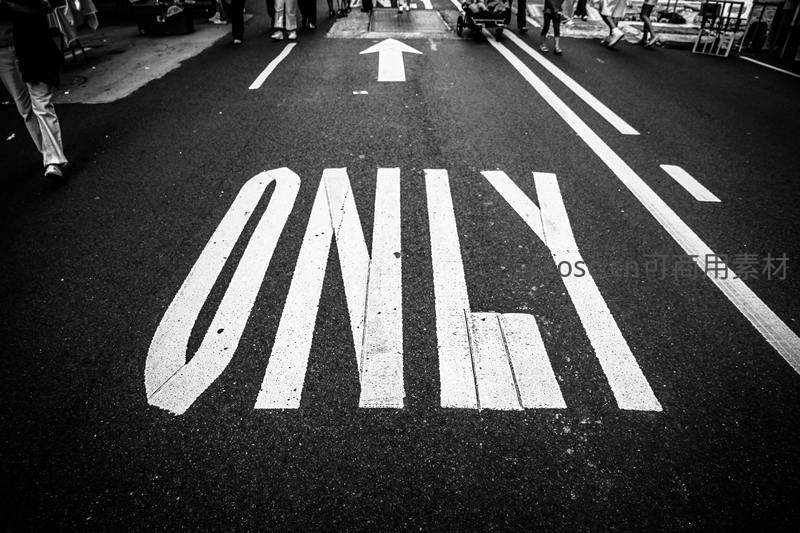 黑白影像中,路面上巨大的“ONLY”字样和箭头清晰可见,行人脚步匆匆穿梭其旁,展现都市街头秩序与流动的生活节奏。