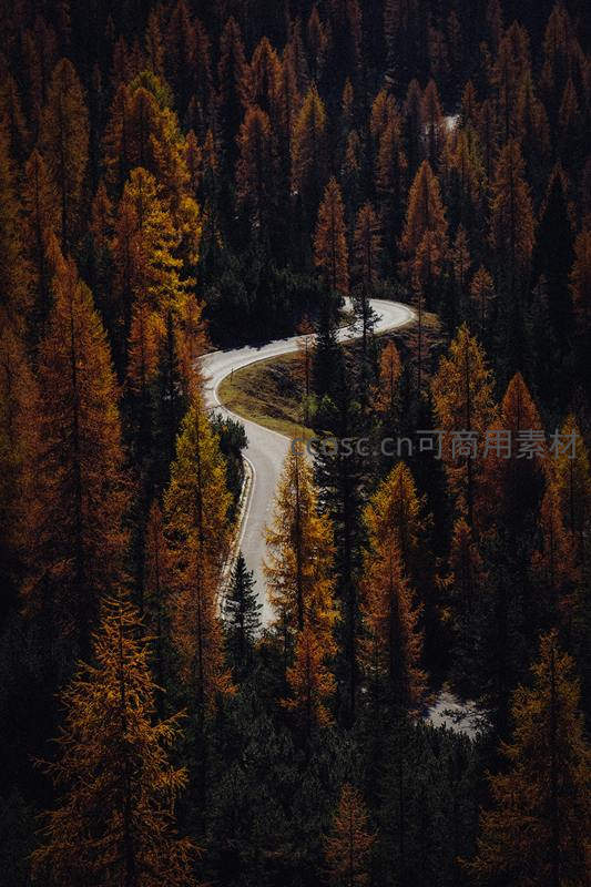 秋日森林中蜿蜒盘旋的山路