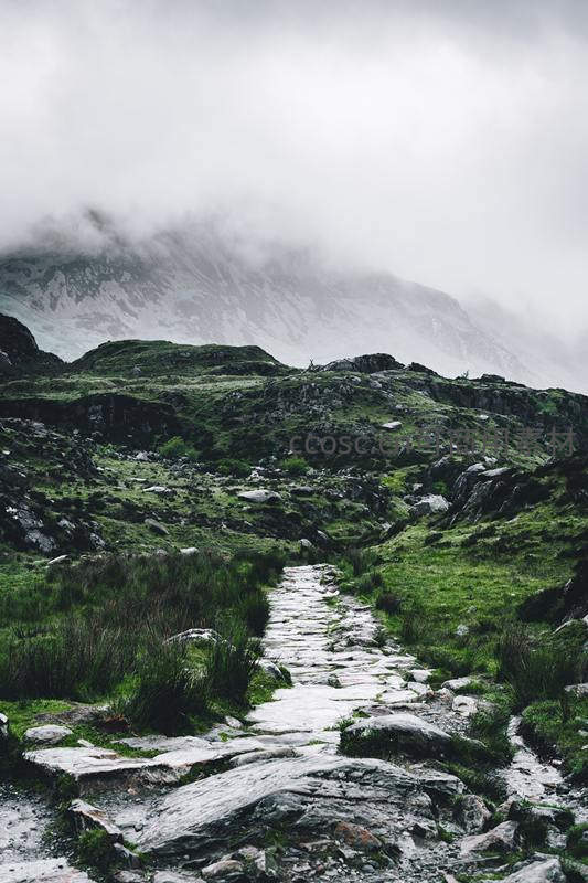 一条蜿蜒的石板小路穿过青翠山峦,远处山峰隐于薄雾之中,营造出宁静神秘的氛围,适合户外探险与心灵放松。