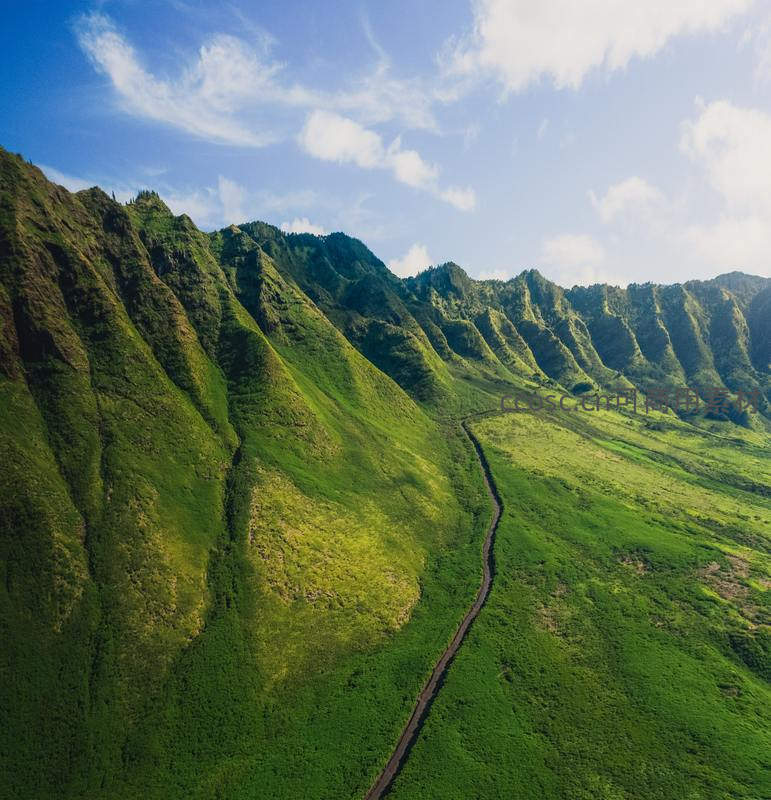 从空中俯瞰,连绵起伏的翠绿山脉间,一条细长的小径如丝带般蜿蜒穿过谷底,阳光洒在山坡上,呈现出明暗交错的层次感,宁静而壮美。