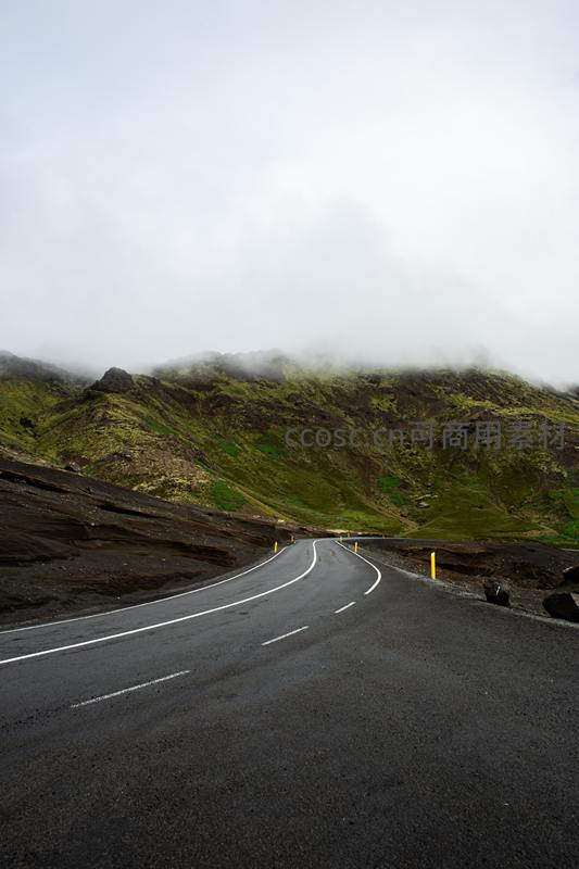 一条干净的黑色沥青公路在苍翠与灰褐相间的山峦间曲折前行,山顶被浓密的白雾笼罩,营造出神秘、静谧且略带孤寂的氛围,引人探索未知。